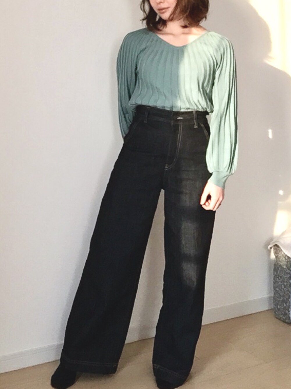 腰周りがフィットして脚が長く見えるワイドデニム。ワイドパンツ履くと小人っぽくなってしまう低身長の私でも合ったので小柄さんにめちゃくちゃオススメ(๑♡ᴗ♡๑)