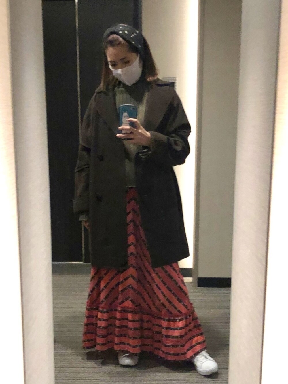 楽しい古着のスカート! おにゅーのカチューシャでキュートに コートとセーターはカーキで引き締め。 靴は白スニーカーでほっこりと。 不思議なバランス。