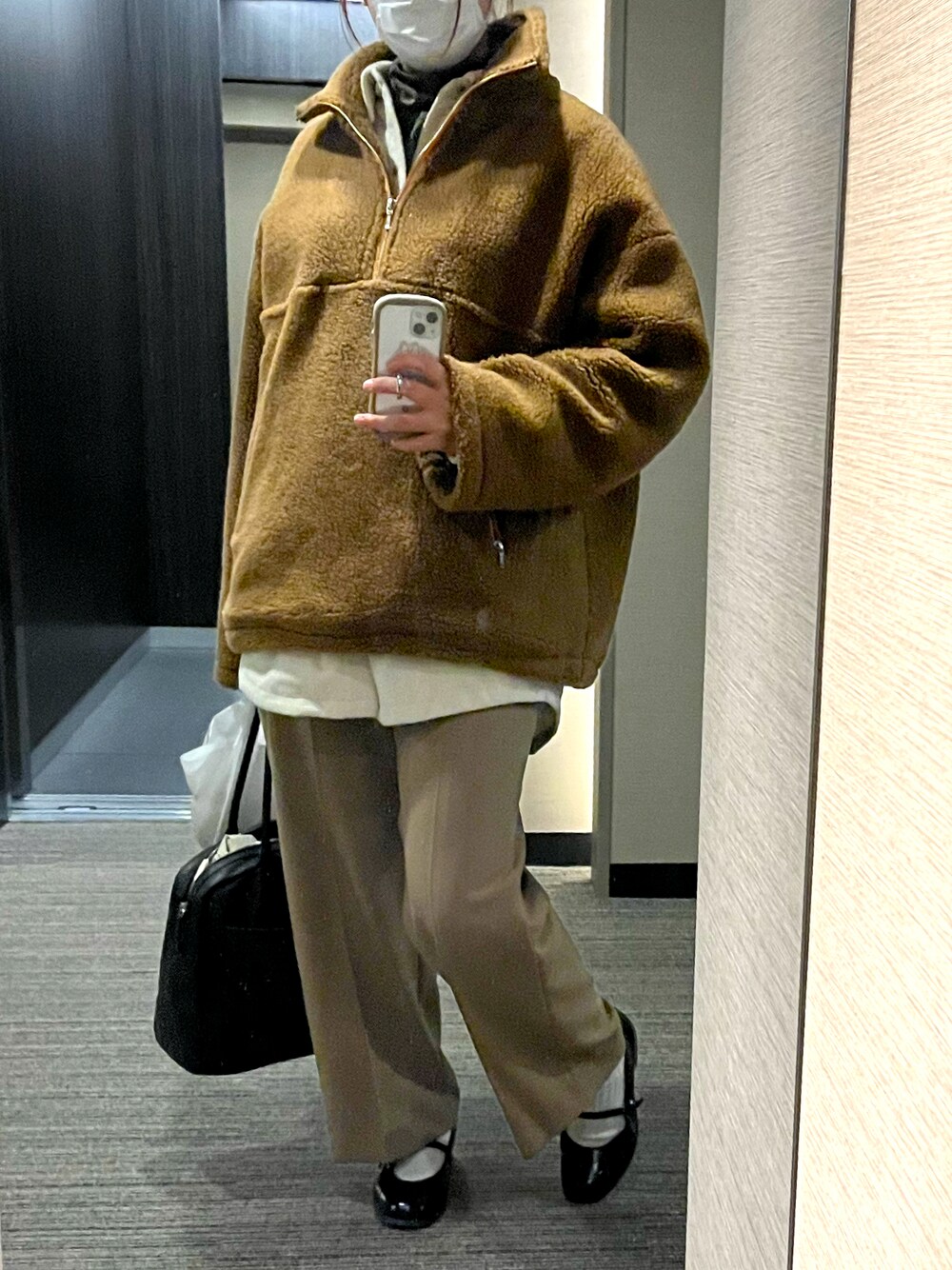 ふわふわのブラウスにもこもこパーカ。 子供っぽくならないようにパンツでバランスを取って。めっちゃあったかいー!