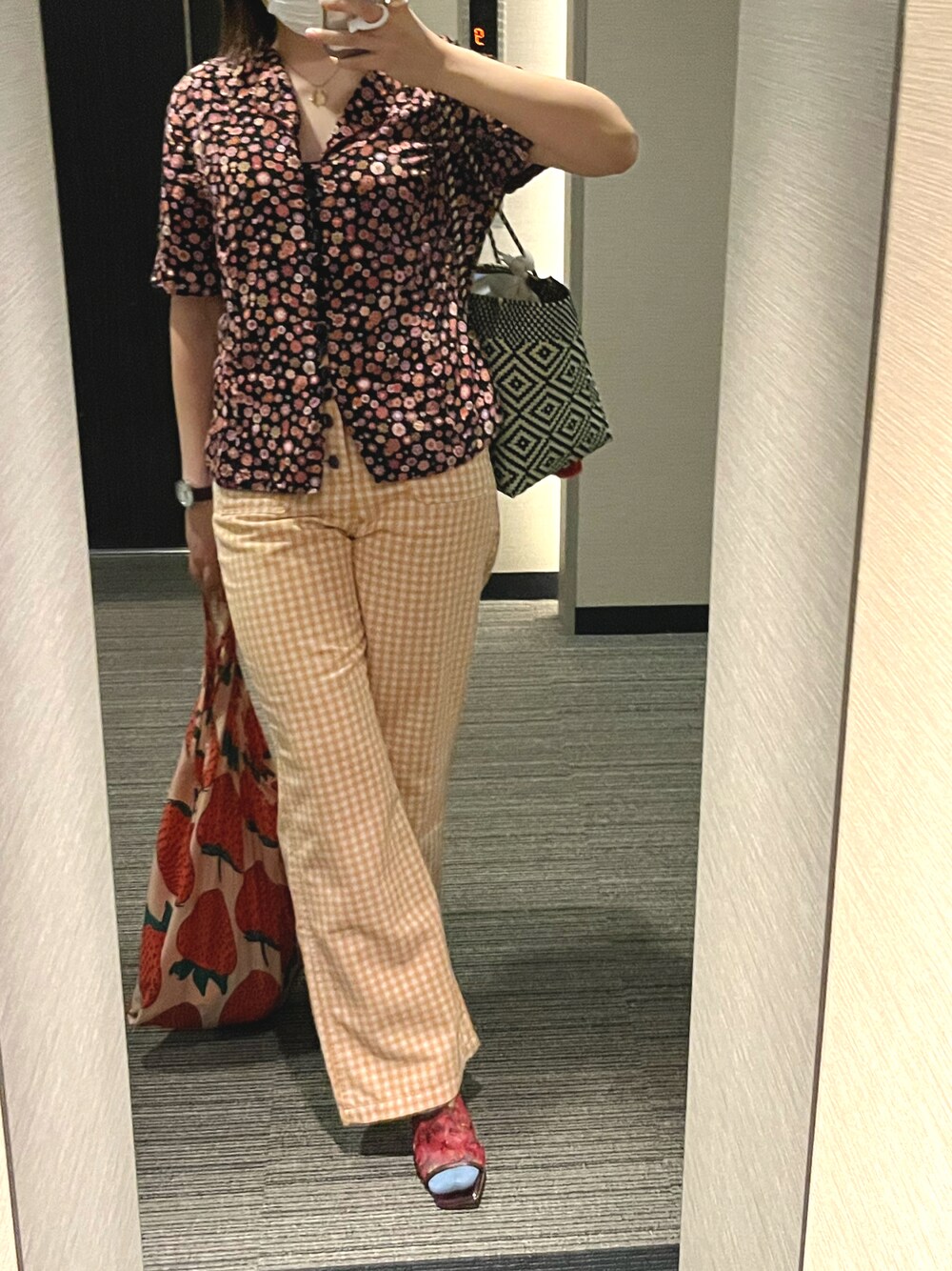 柄まみれです。楽しい! 古着のブラウスはチェルシーみたいな花柄が好き!パンツはギンガムチェックでマリン感がかわいい!
