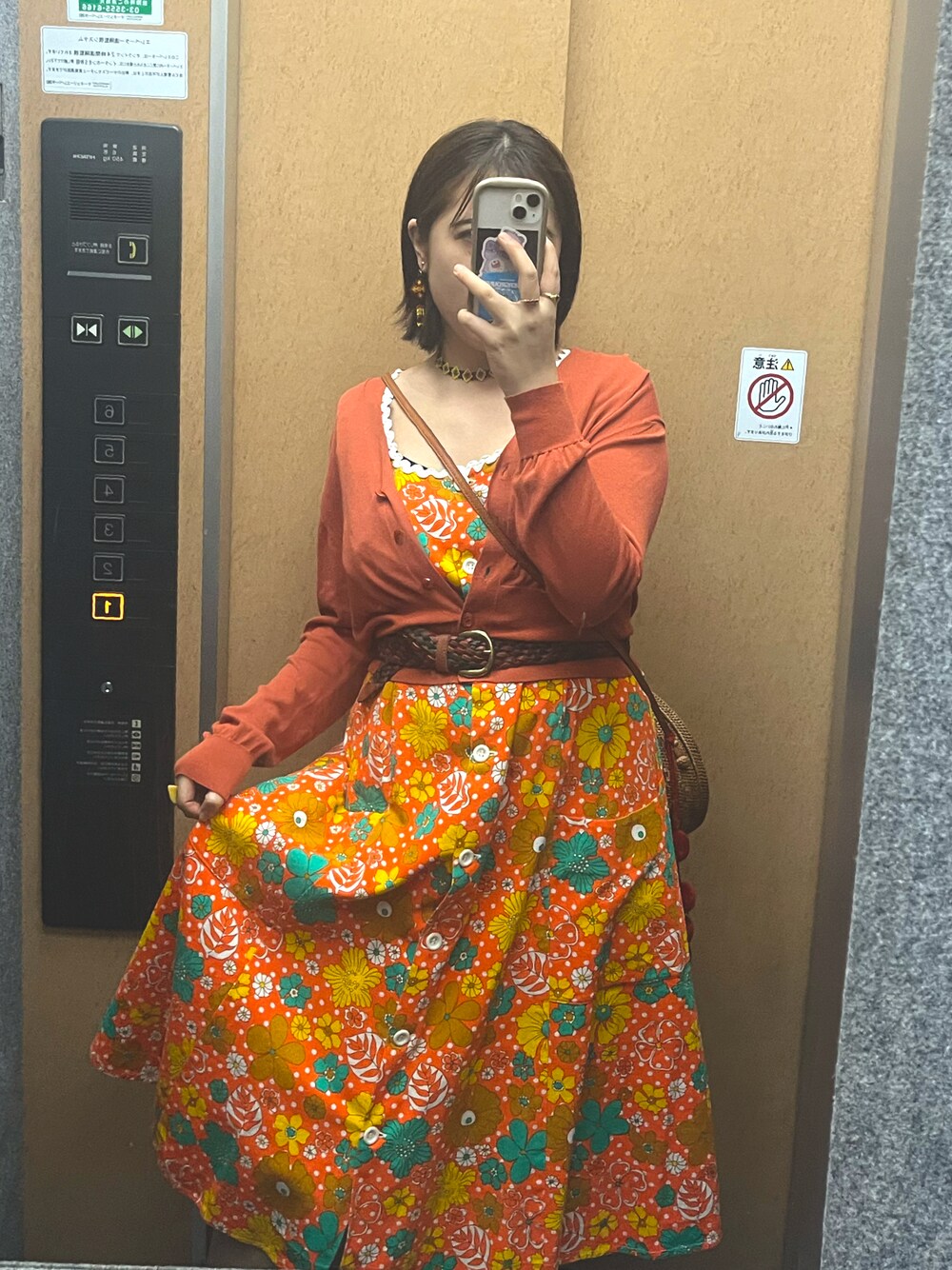 オレンジ系のワンピース/ドレスを着用したレディースの春コーディネートの1枚目の写真