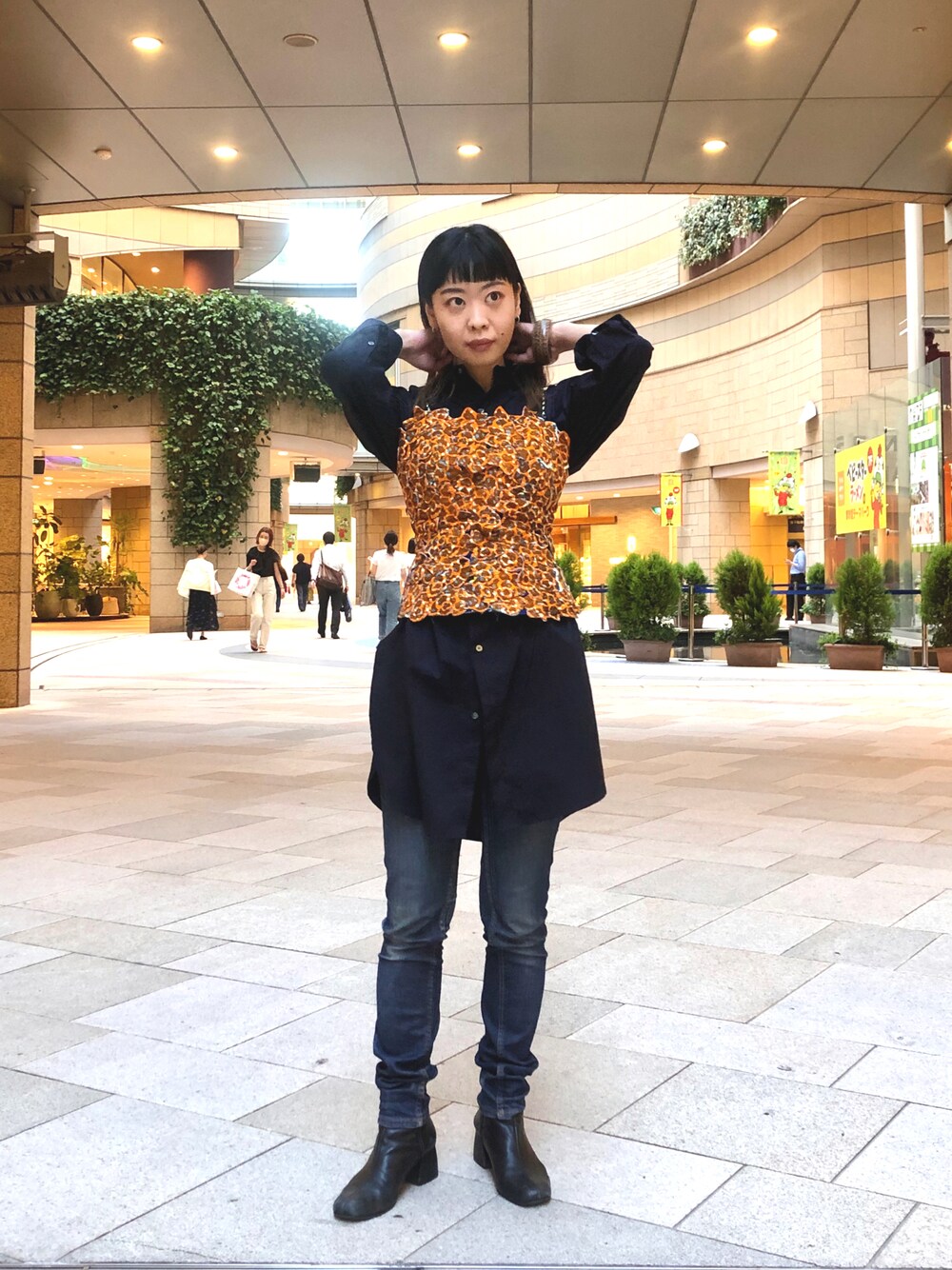 ビッグサイズのシャツに、ビスチェを上からつけて敢えてシルエットを変えて着用しています。