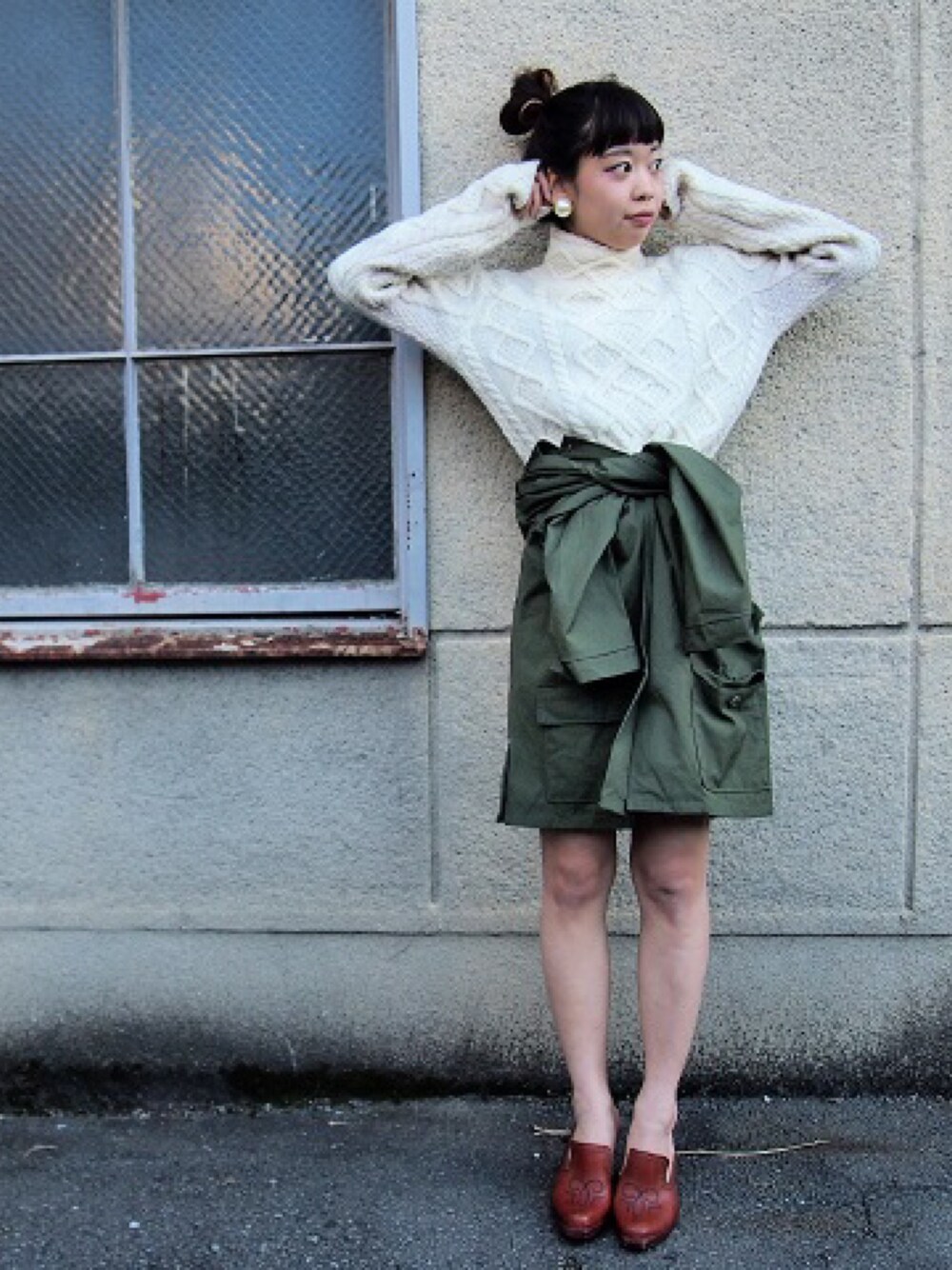 ハイネックのケーブルニット。 にスカートはwomenのファティーグジャケットをボタン外して腰に下ろす。 ラップスカートのようになり、巻いた袖の部分もアクセントに。