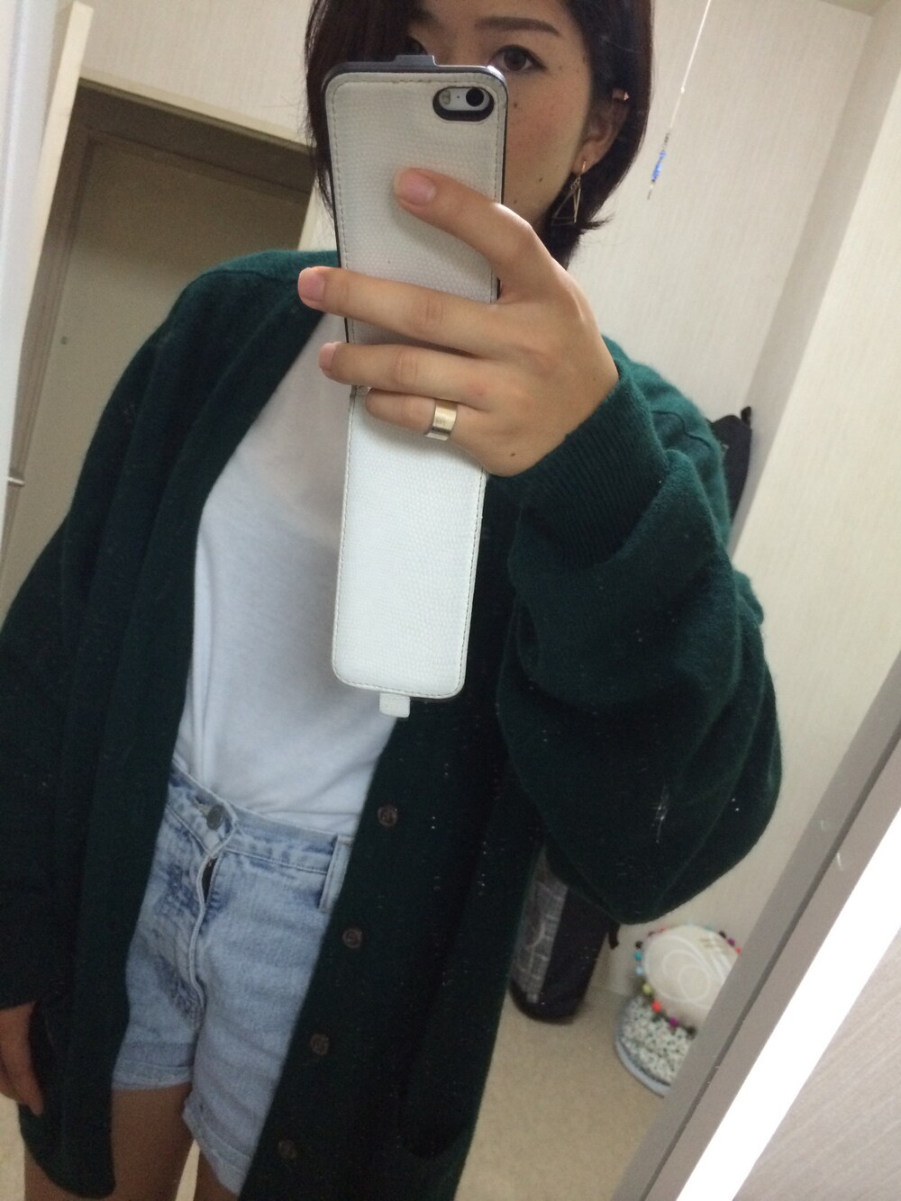 中は、白系で統一して緑のロングニットを目立たせて見ました。 今日は、肌寒いくらいだったのでニットは、正解でしたね!