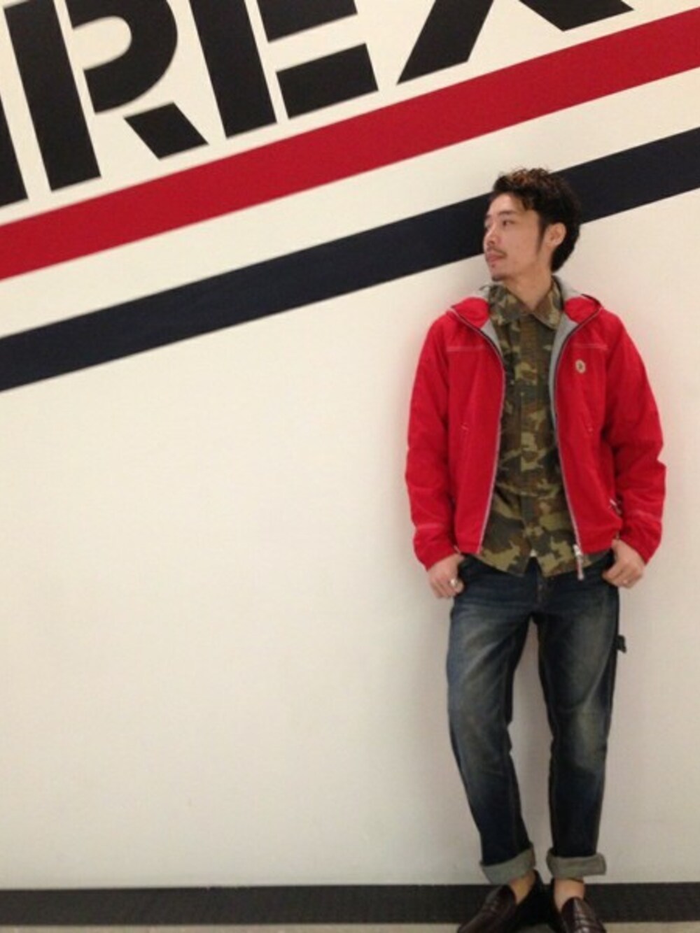 AVIREXらしく迷彩柄のシャツを使用し、ナイロンパーカーでカジュアルダウンさせました♪