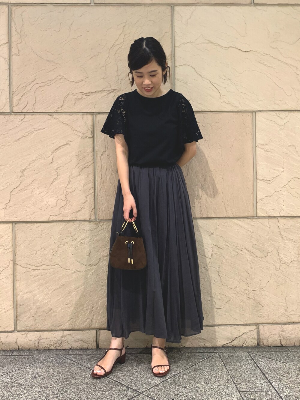 ワントーンコーデでスタイリングしてみました! トップスはレーススリーブになっており、1着でとても華やかに着ていただけますよ。 小物もブラウンで統一して大人カジュアルにまとめたした。