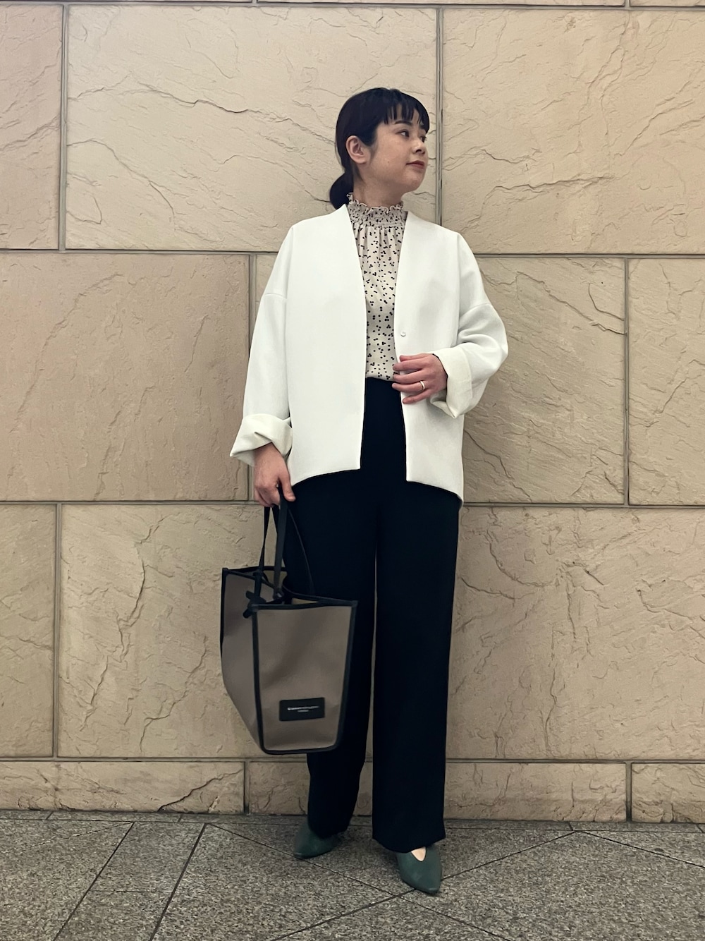 【ブラウス】 一部店舗限定のブラウスが入荷しております!ハイネックでジャゲットやアウターのインナーにも映えるドット柄です。 ネックラインや袖口がゴムなのでとても着やすかったです。 【ジャケット】 ELENDEEK別注のジャケット。 シングルカラーなのでカジュアルキレイめどちらでもテイスト合わせていただけます。