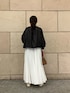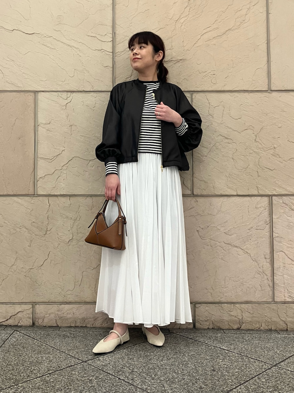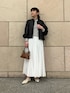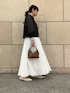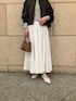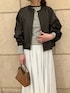 【ブルゾン】 光沢感がありカジュアルすぎず綺麗めなテイストでも相性良いです! ドロストのコードが裾にあるので絞るとシルエットも変えていただけます。 【スカート】 コットンスカートは程よくボリュームが出ます。ウエストゴムで履きやすく164cmでくるぶし上くらい。割と長め丈です。 ポリエステルの裏地が付いているので透け感心配せず着用できます。