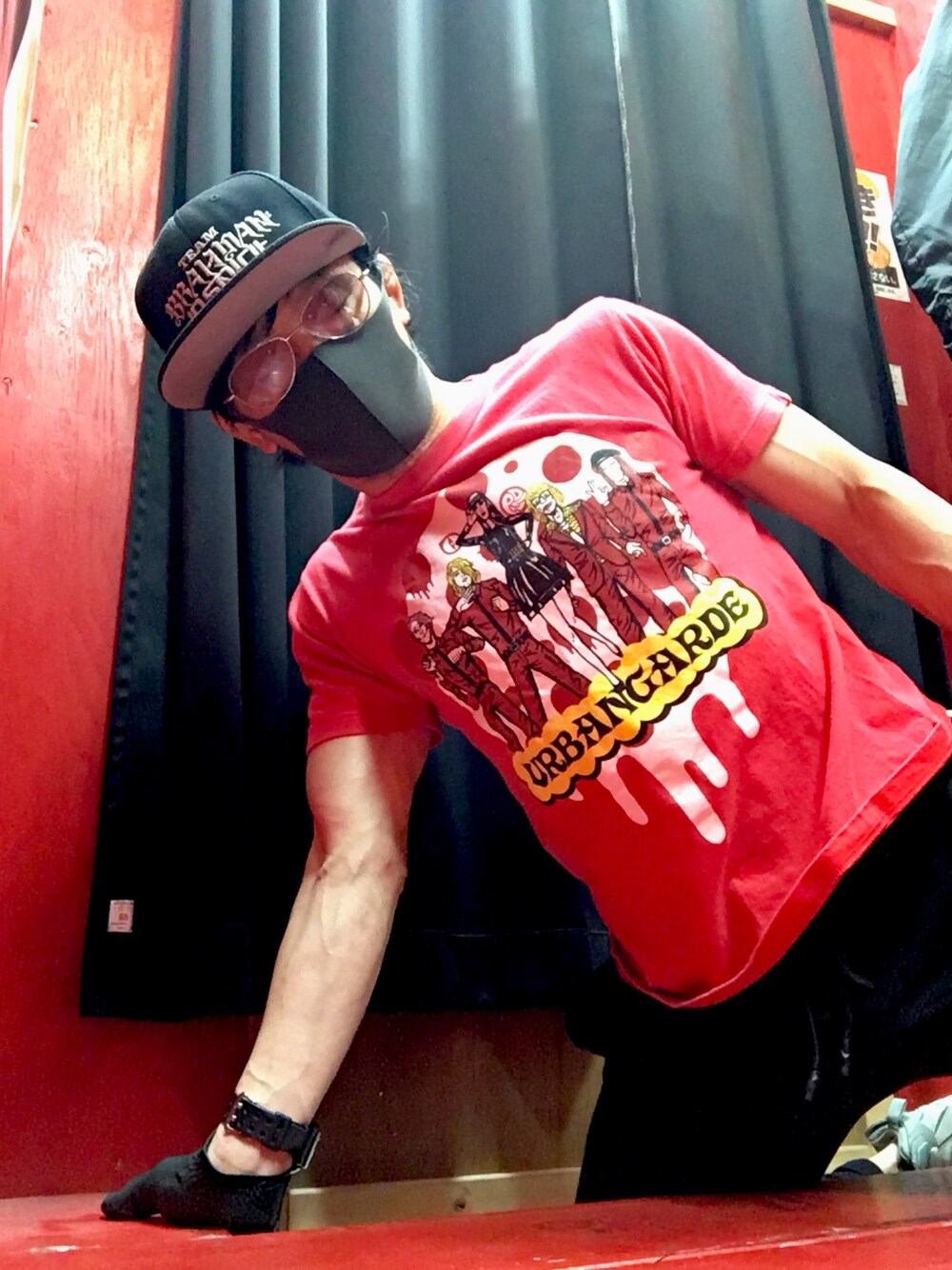 レッド系のTシャツ/カットソーを着用したメンズの春コーディネートの1枚目の写真