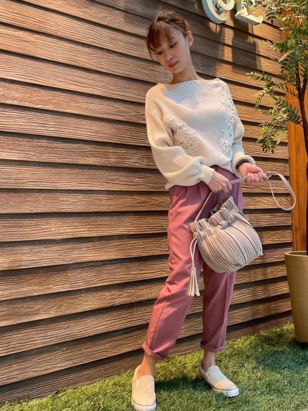 こんにちは! 今回もシューラルー15周年記念のタイミングで発売されたテーパードパンツのスタイリングです(o´艸`) せっかくのカラーパンツなので、 普段ははかないカラーをチョイスしてみました♪♪" ピンクだけどくすみカラーなので 私の様な大人女子世代の方にも抵抗なくはいていただけます! トップスは刺繍のデザインが入ったニットです。シューラルーのミセスラインのアイテムなんですが、形やデザインがとても素敵なんですよ♡♡ デコルテのラインが大人っぽくて良いです♡♡ 靴とバックはカラーを揃えてみました(〃▽〃) どうでしょう。 カラーが入ってるのに、いい感じにまとまってるのではないでしょうか?? 小窓には同じパンツでオフィスコーデを組んだのでそちらを載せてます。 オフィスコーデの投稿も是非見てください! シューラルーでは3Dパンツご試着キャンペーンを行ってます!是非お店に足を運んでみてくださいヽミ ´∀`ミノ< 最後までご覧頂きありがとうございます。