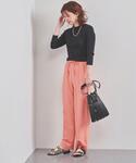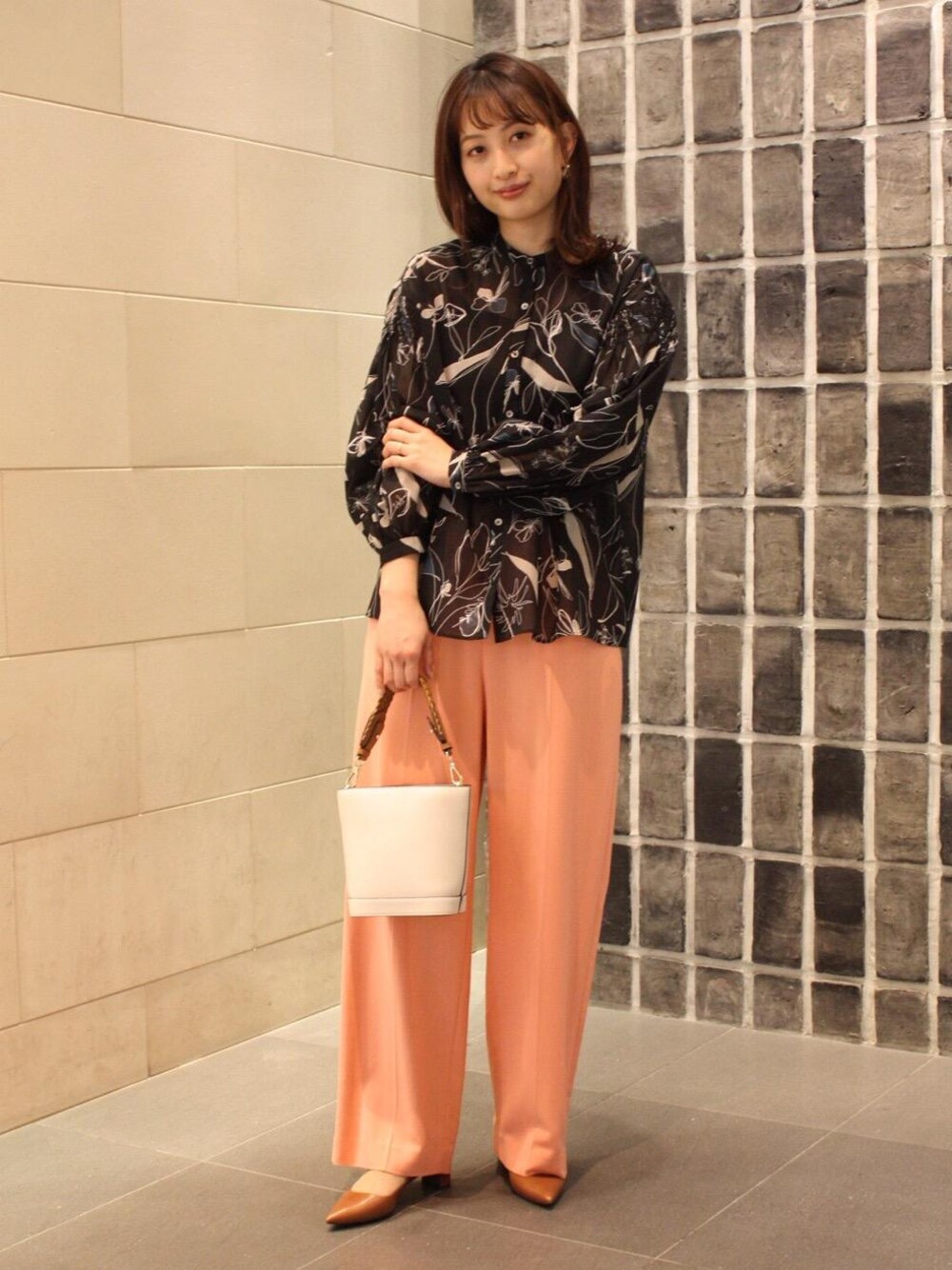 カラーパンツの色が透けて見えるようなシア素材のブラウスを合わせたコーディネート。白のバッグで抜け感を出しました。