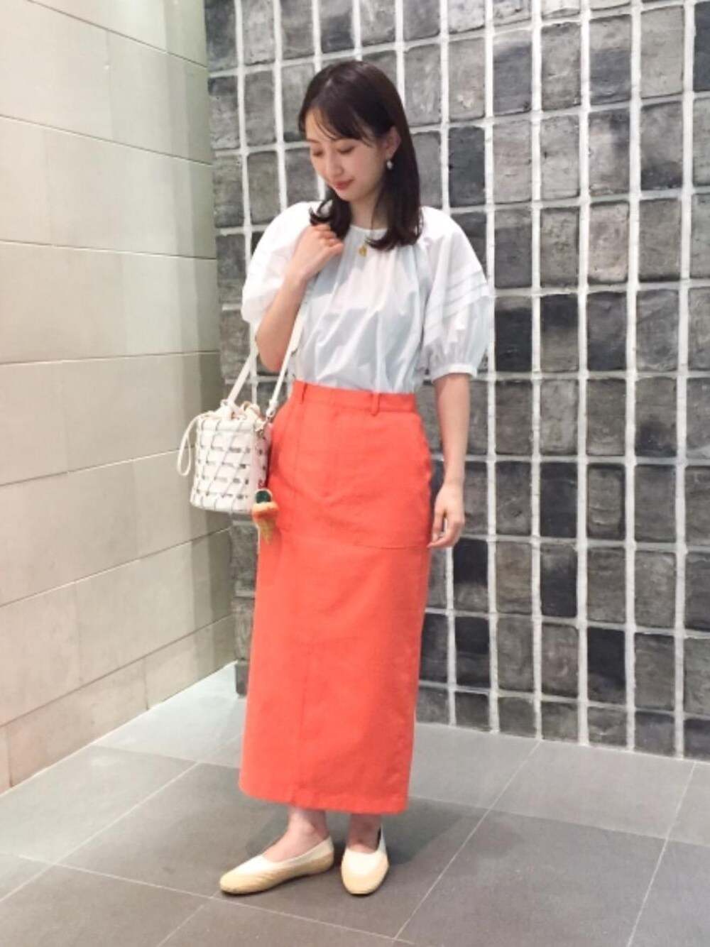 袖にボリュームのあるトップスは、タイトスカートと合わせてメリハリが出るようにコーディネートしました。スカートのカラーがメインになるよう小物はホワイトで統一しました。