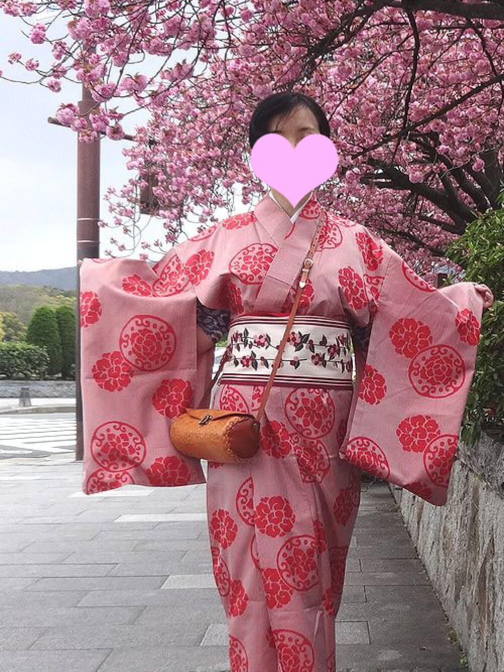 長岡京市立図書館の八重桜です。 塚口の三河屋さんで買った単衣の銘仙(6000円)。 帯は居内商店さん(3400円)。