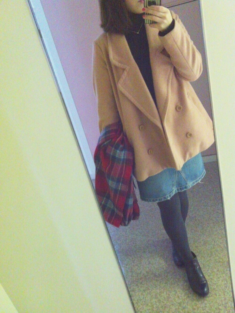 アウター:Heather タートルネック:無印良品 タイトスカート:古着屋さん 赤チェックのマフラーを 古着屋さんでゲット٩( 'ω' )و!