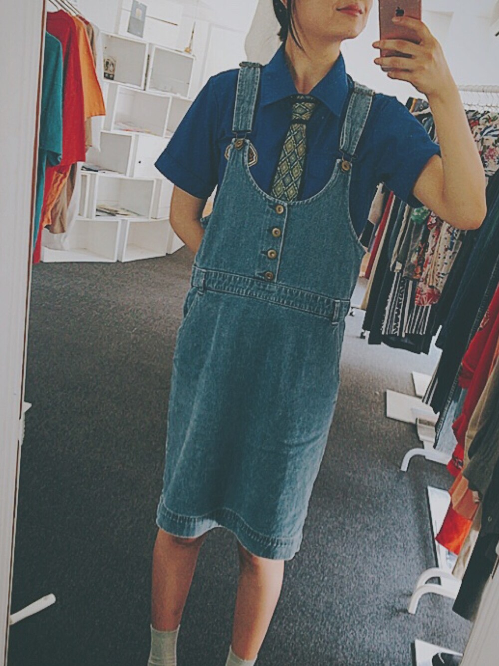 コバルトブルーのシャツと リアンブルーのサロペットスカート。 柄が強いネクタイを締めてアクセントに。 足元はグレーの靴下と ローファーで落ちつかせて。 目立ちたがり屋の青ってかんじ。