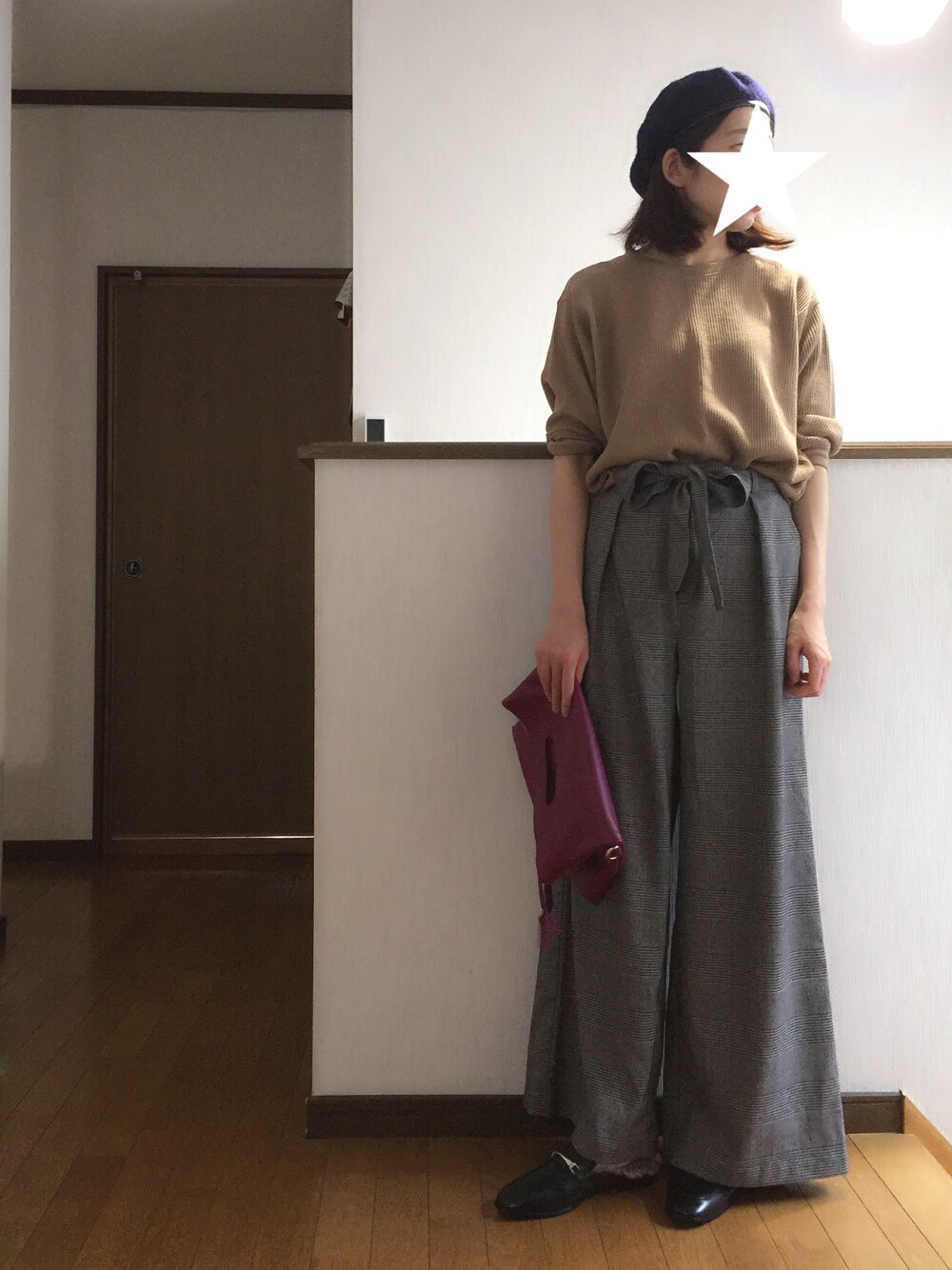 いつもご覧いただきありがとうございます😊 そして♡、お気に入りありがとうございます✨✨ 本日もプチプラ〜 色地味なのでバッグはパープルでポイントに。