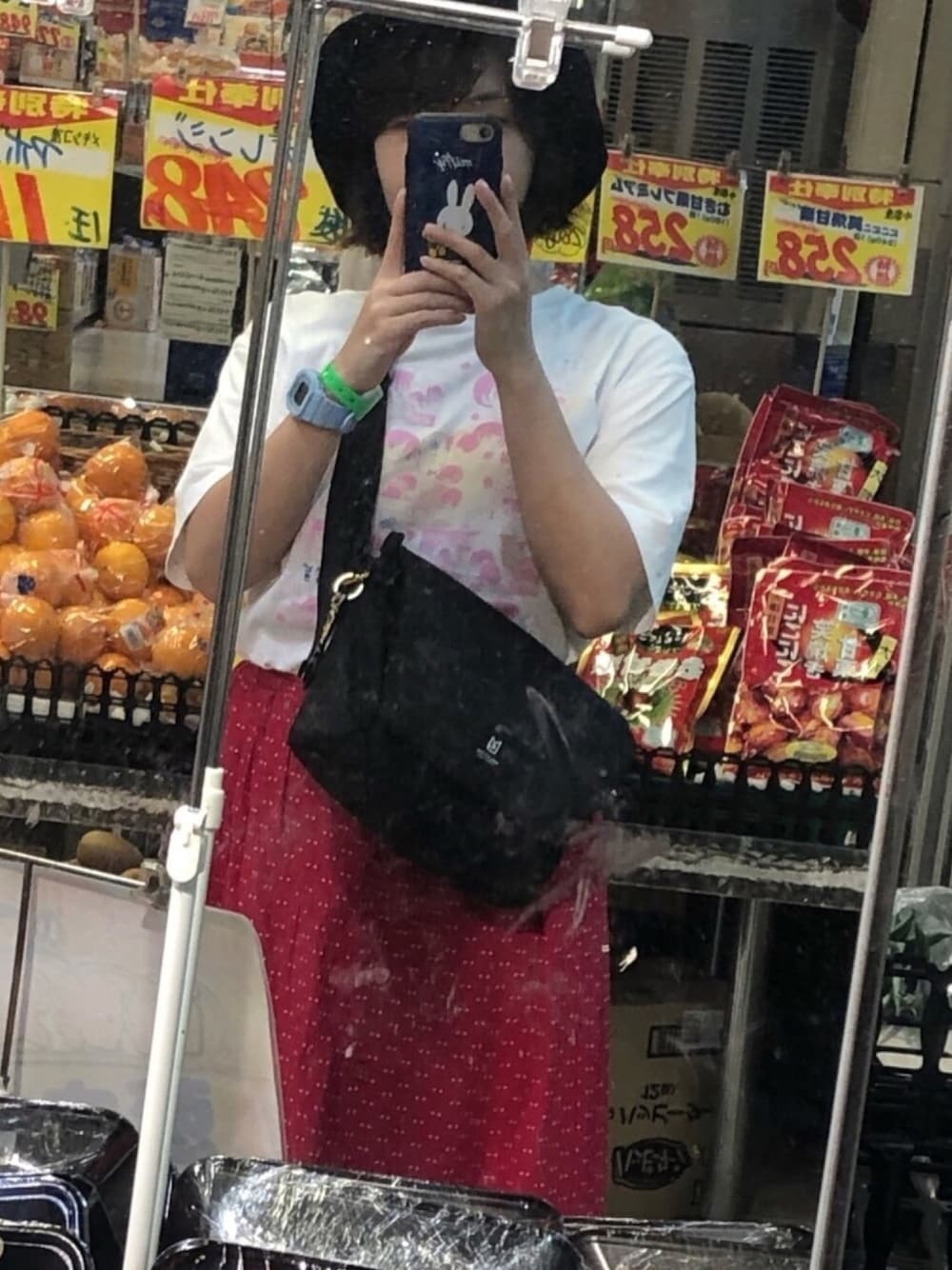先週コヤソニ行ったときの! 大阪!っていうイメージの格好してみました😌 らんまのTシャツが可愛いの🥰 初めてスーパー玉出に行った〜ギラギラだった〜 鏡がきたない〜笑