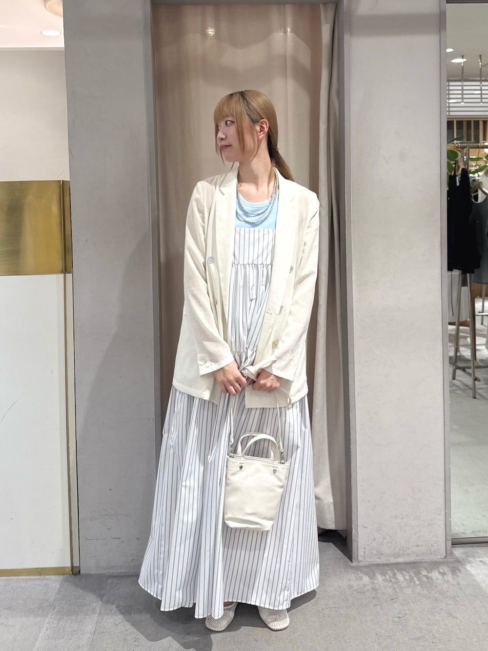 ティアードワンピースをメインにワンピースコーデを組みました! 水色と白色で涼しい雰囲気に🌀