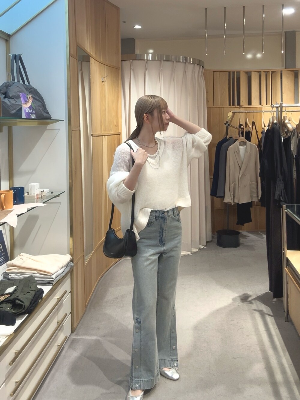 ふわふわ肌触りのニット✨️キタンクトップとのレイヤードスタイルになっていて着るだけで こなれ感◎ ボタンがアクセントのデニムパンツは開けてフレアデザインにも!