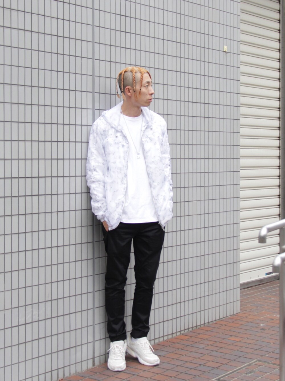 大理石モチーフのナイロンジャケットのよさを殺さないようにインナーはフロントにプリントがないものを選びました。 STAMPD新作のDANTE PANTSはカラーも豊富でそのシルエットがオススメの一本です✨