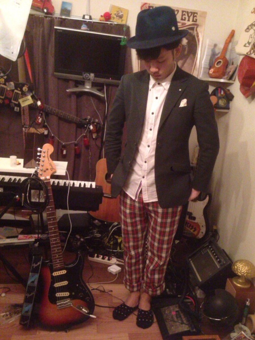 緑のオーダーメイドジャケットに、チーフとパールのピンバッチでフォーマルさを出しながらチェックパンツでカジュアルさをミックスしました! 普段スーツで仕事してるのでジャケットを使い私服アレンジ!