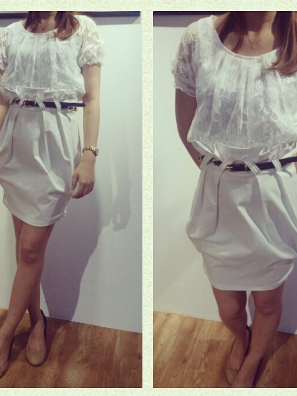 白コーデ\(^o^)/ ベルトをネイビーにしてマリン風にしたよ(^^) トップスはストライプの生地にレース重ねでお洒落なやーつ。 BY → Unchulle’emu