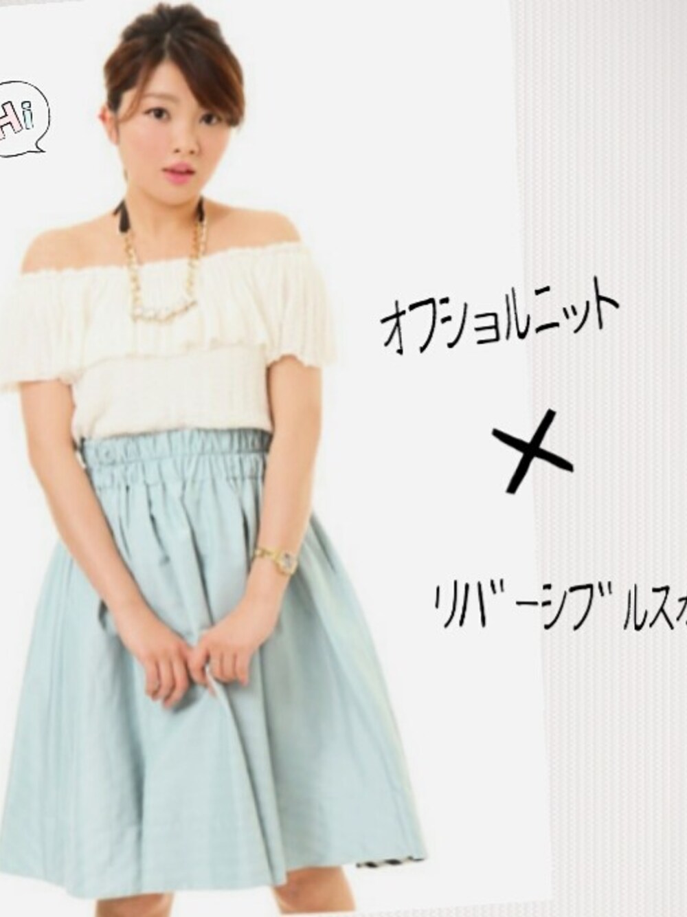 オフショルで今年らしさでるけど、 更に膝丈スカートでトレンドっぽく(^-^) 本当に持ってる服ミントばっかだなぁ(笑) スカートはリバーシブルで裏返すとストライプになる2way\(^o^)/
