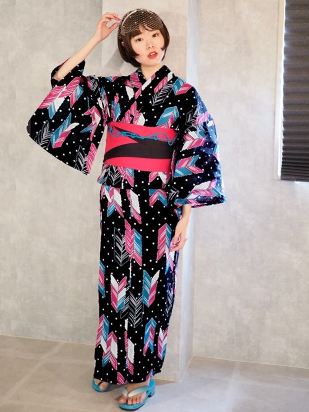 黒地だけど、細かい水玉と矢絣の色目で少しPOPに。 サイズ:F モデル身長:162cm