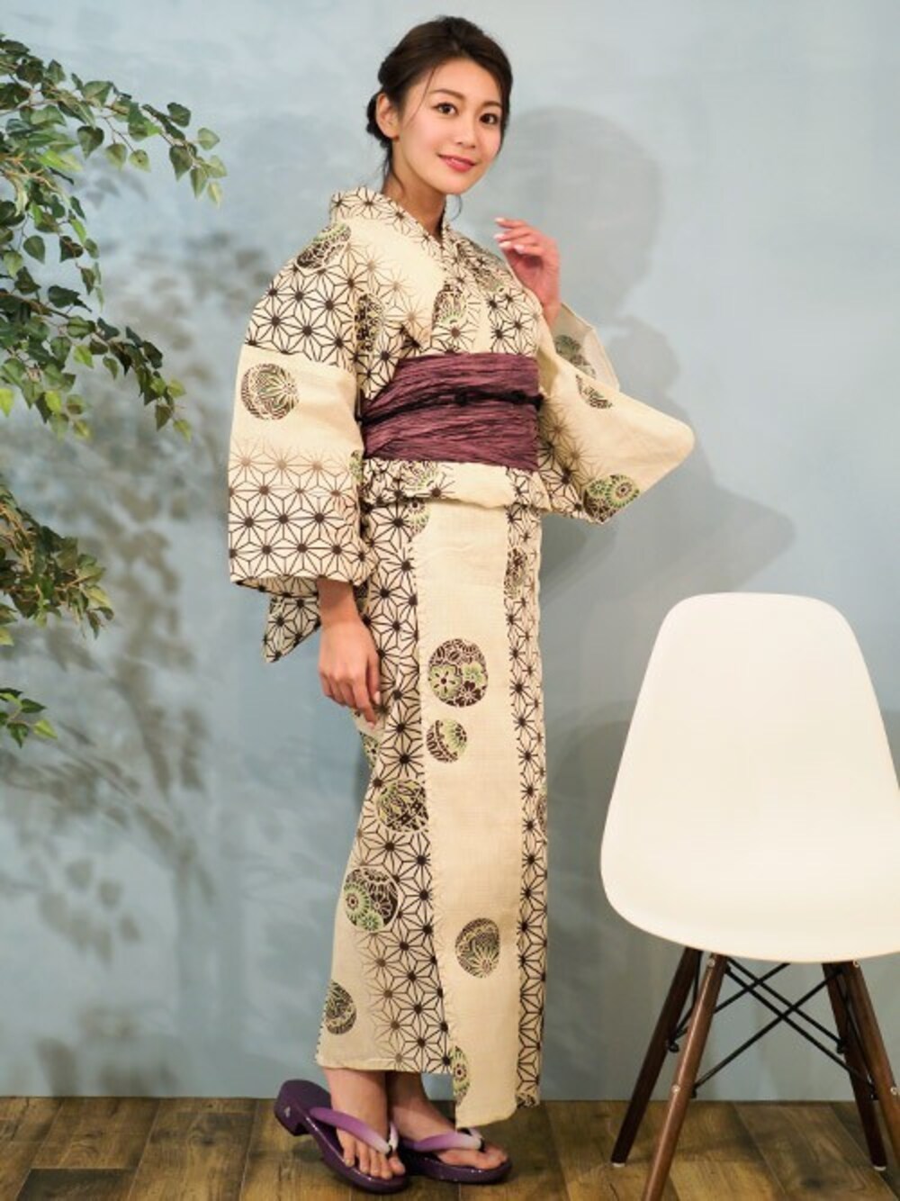 いつもより、ワンランク上の綿麻浴衣。 古風な鞠柄がレトロで◎ サイズ:F モデル身長:160cm