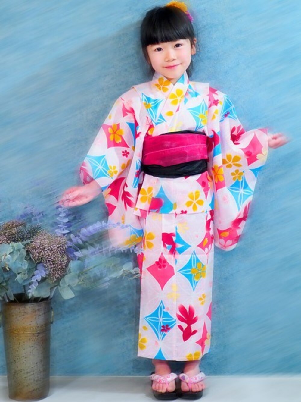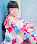 ピンク系の浴衣を着用したキッズの春コーディネートの1枚目の写真