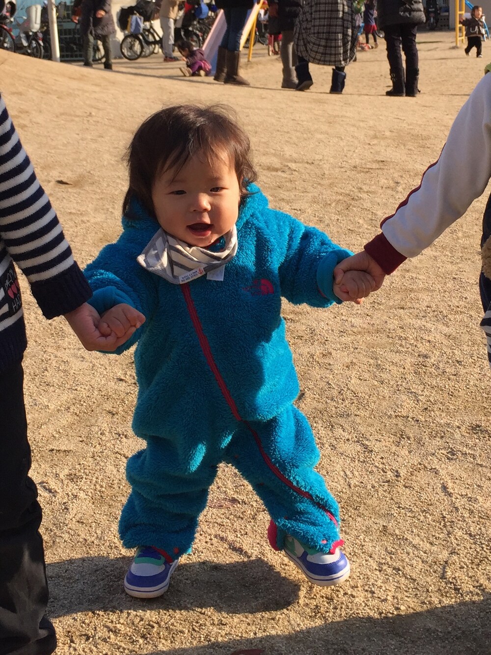 おねーちゃんの幼稚園で強制的に歩かされる1歳。笑ってるけど、この後引きずり回しの刑にされてました。。(^^;;