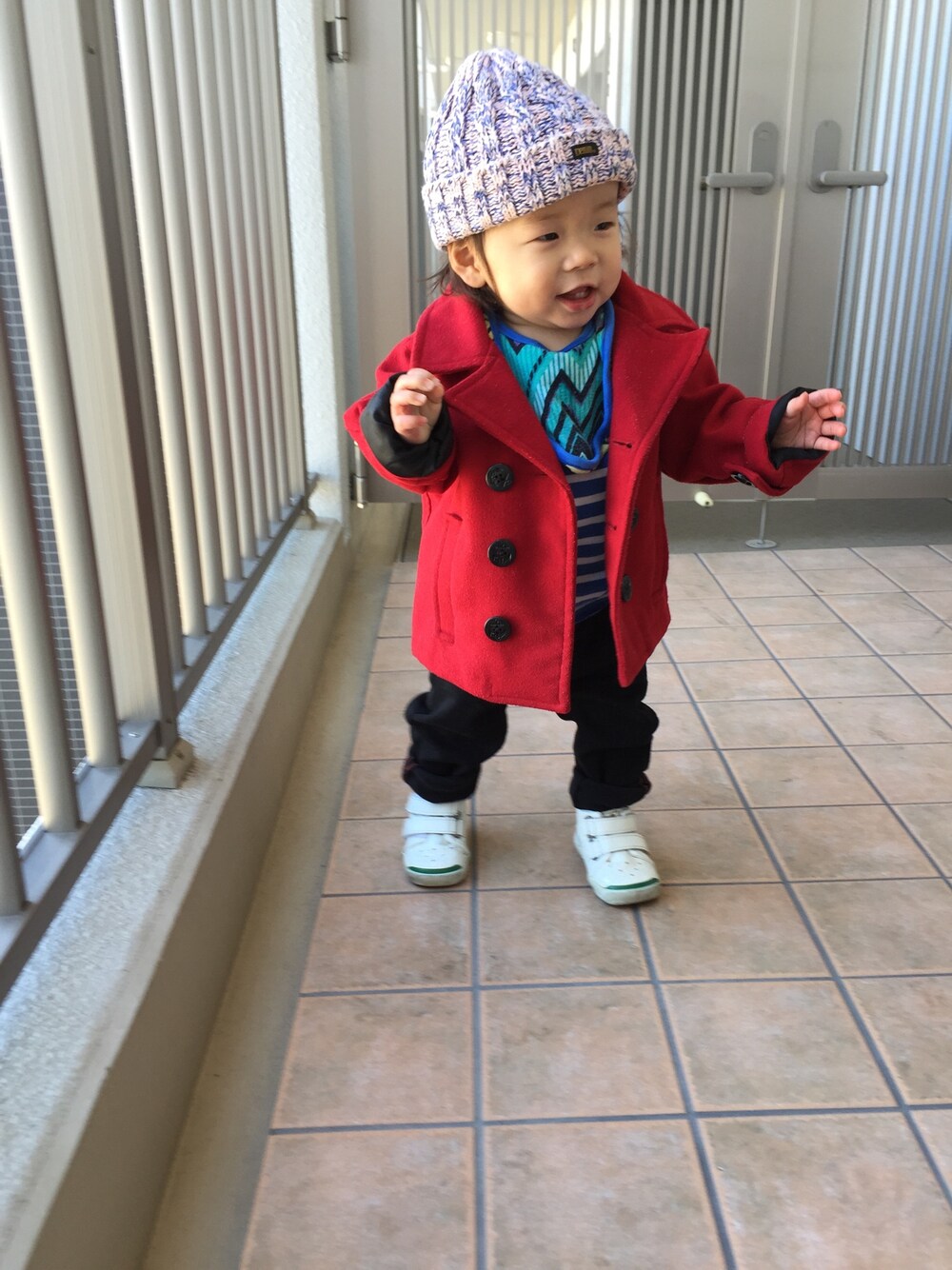 赤のPコートを着せたくて。。 ニット帽の向きがヘン(^^;;