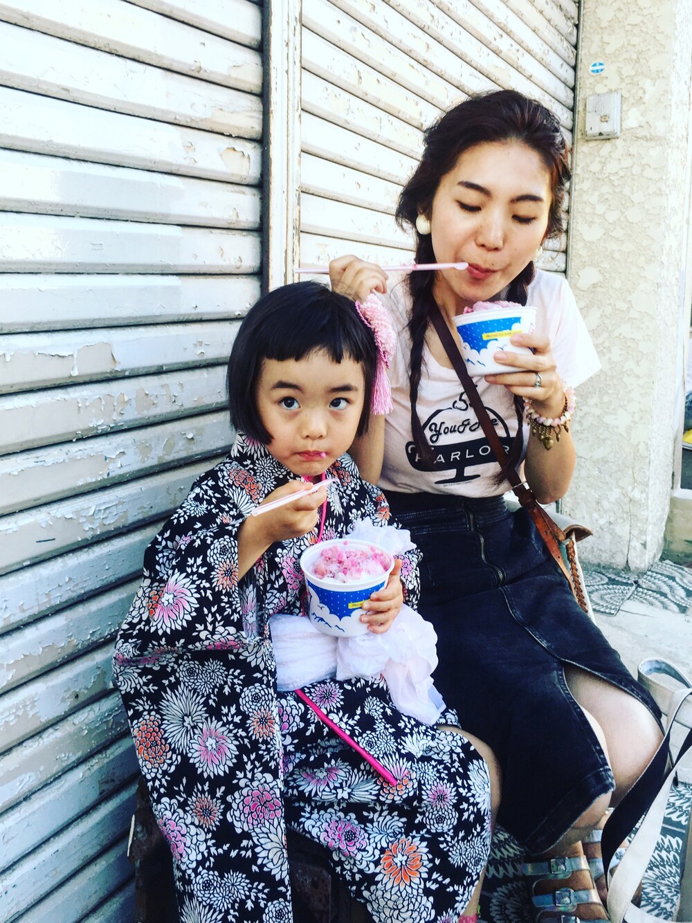 食べるのに夢中になりすぎてなぜか鼻の下が伸びてるわたくし😳💫 . #手動かき氷機 #果肉入りシロップ#激ウマなのに350円🙏😇#夏祭り#親子#👧🏻👩🏻🍧#一口交換は絶対のルール