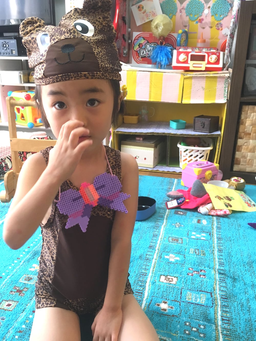 やっぱりこの水着サイコー👏😂 ヒョウ柄のクマかな?! 謎の生き物🐻🐆⚡️ 大阪の義母さんのセンスに脱帽👸🏼🙏🏼