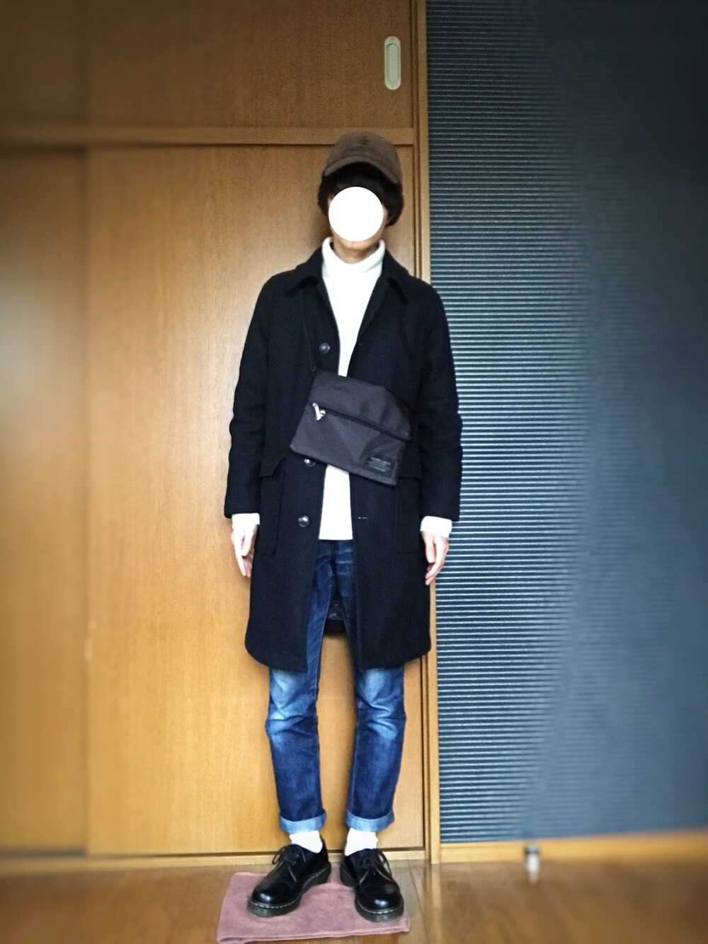ステンカラーコートとドレスシューズを、キャップとサコッシュで崩しました。 niko&の白タートルもアクセントになっております。