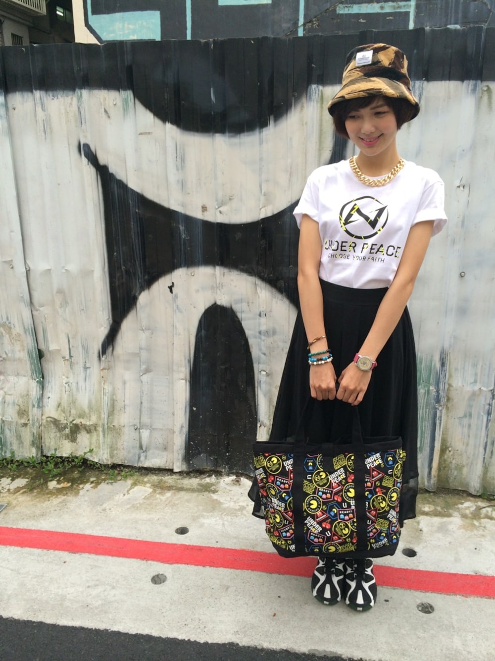 甜美女孩打扮 漁夫帽+白TEE 絕對是夏天必備 長裙x球鞋的組合也是相當的具有甜美活力感 TEE,CAP,BAG by UNDER PEACE