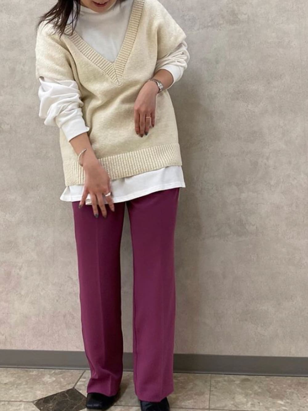 アンダープラウ AEON釧路店のベスト「ルーズVネックニットベスト」を使ったコーディネート