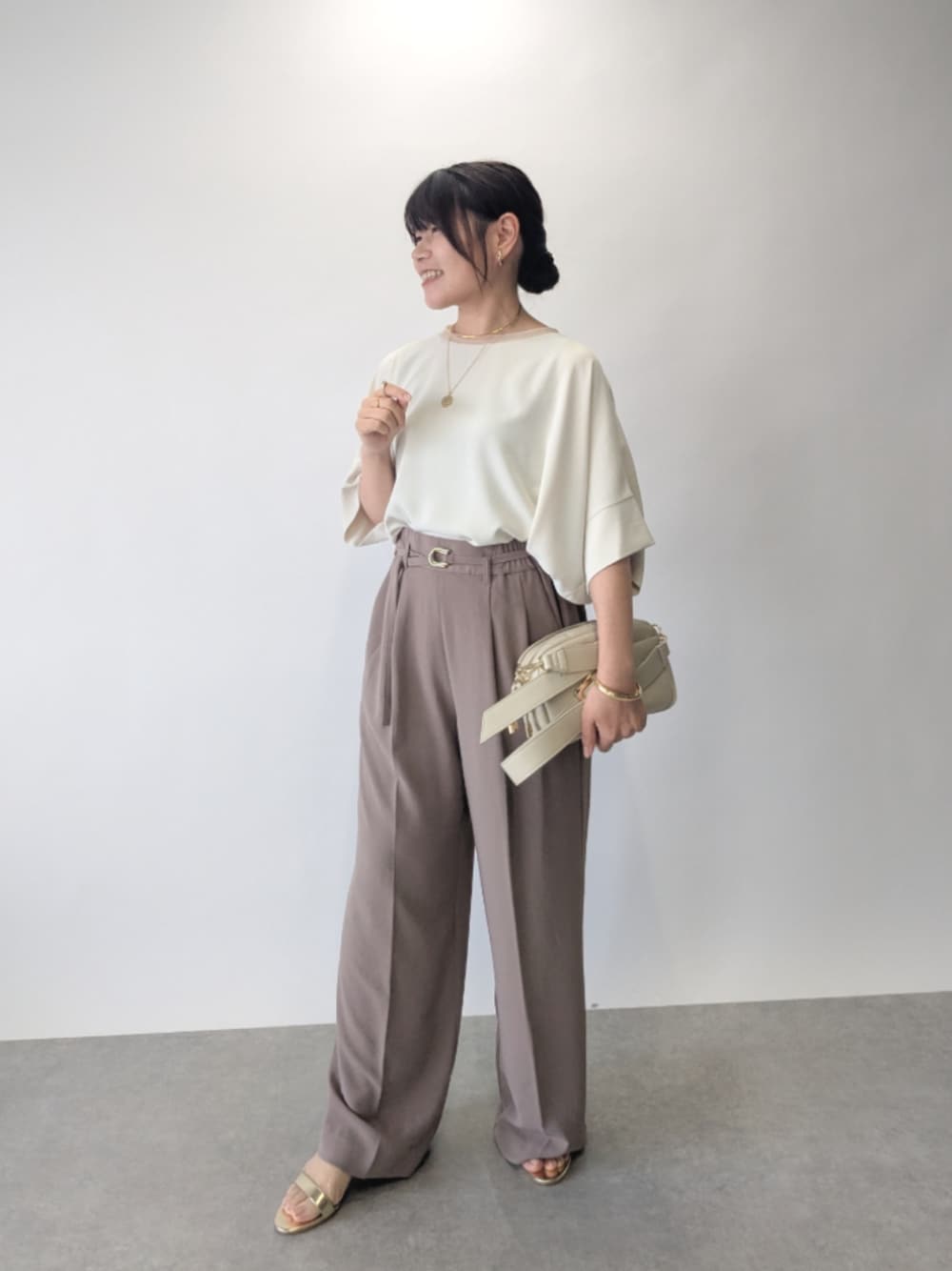 トップスとパンツで違うカラーを組み合わせたセットアップコーデ。 とろみ感かあり着心地が良いアイテムです!