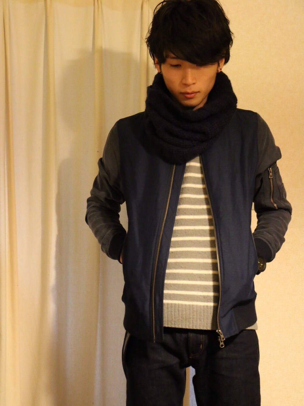 まだ朝晩は肌寒い。 ということで久々にスヌード。 ネイビーを軸に カジュアルコーディネート。 MA-1ブルゾン studious ニット 家にありました デニム 同じ スヌード name. スニーカー コンバース