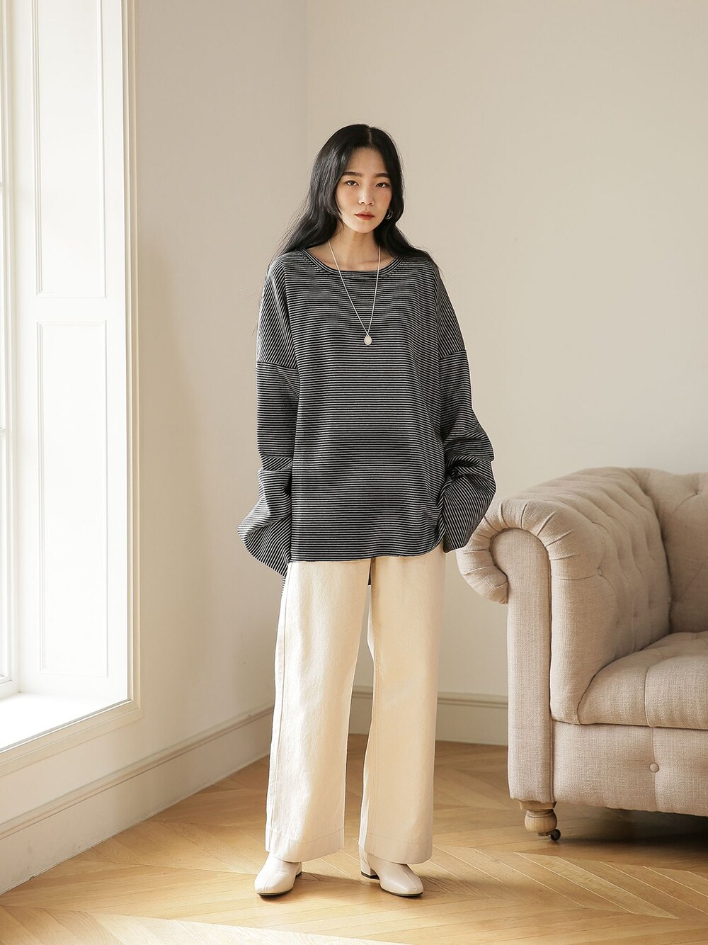UNE MANSIONのTシャツ/カットソー「ボーダーオーバーサイズワイドスリーブロングTシャツ」を使ったコーディネート