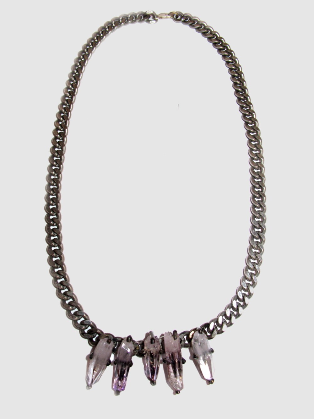 Stainless steel or plated brass curb chain and sterling silver settings with 6 raw amethyst crystals.