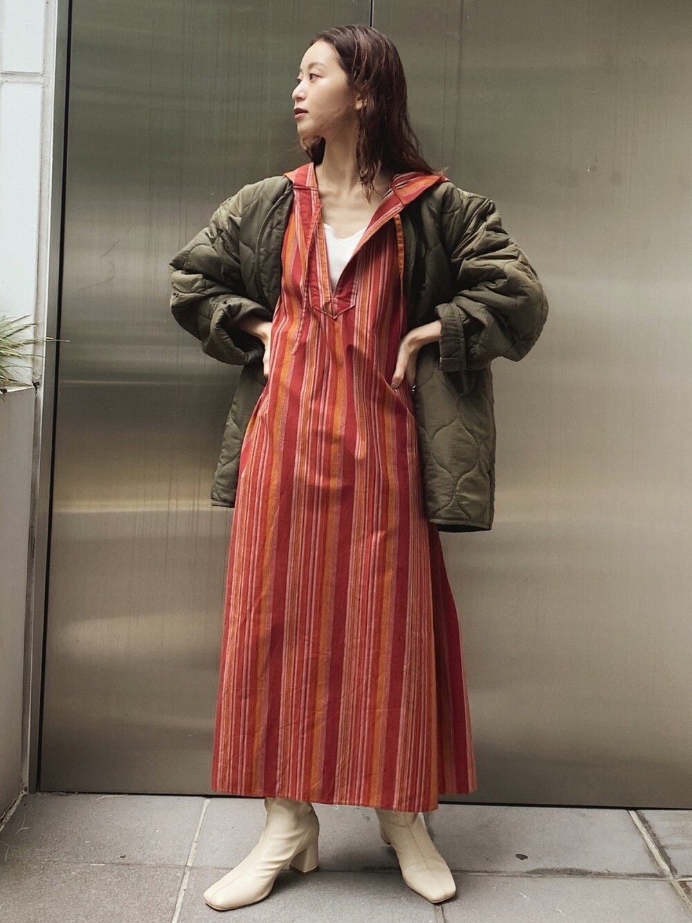 小山 愛梨のシャツワンピース「フードマキシロングシャツワンピース」を使ったコーディネート