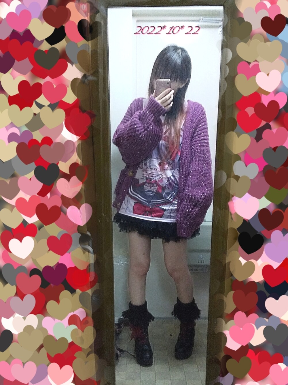 2022*10*22*sat 2018年にsprayで購入したビッグカーディガン、ダボダボ感が大好きです。 中には、病み可愛い少女のTシャツです。 足元は寒いんで、レッグウォーマーです。
