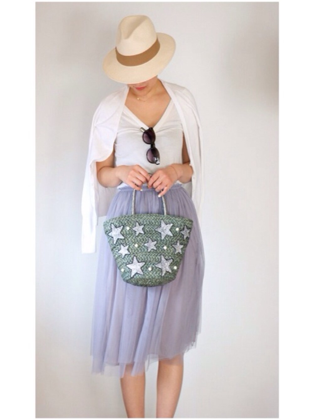グレー系のスカートを着用したレディースの夏コーディネートの1枚目の写真