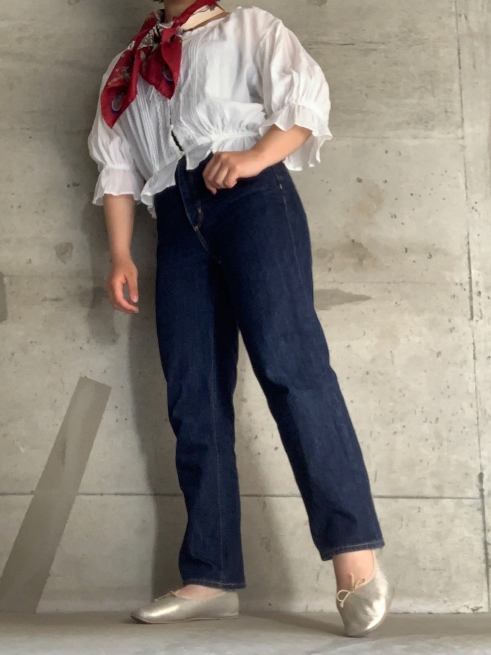 神デニムコーデ GUのハイウエストストレートジーンズのインディゴに短めトップスを合わせました 首まわりがかなり広いトップスにスカーフをアクセントとしてもってくるのオススメです、! 🦊でした