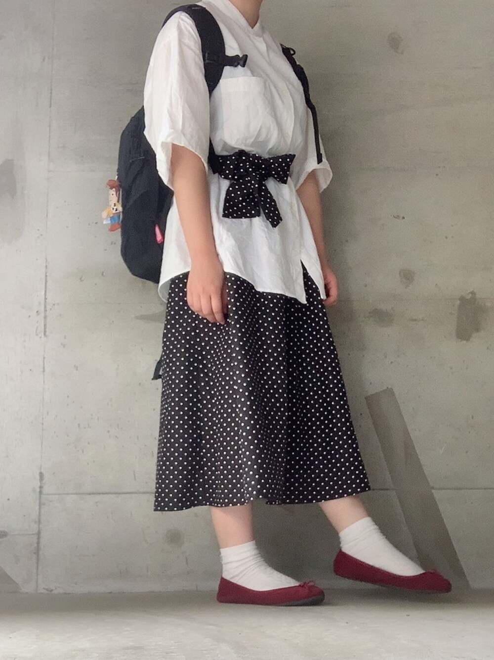 おはようございます☂ ボリュームトップスはインしないでアウトで! ウエストマークは高めに、スカートと同じデザインのもので合わせました、! レトロな女の子になりきりたかった通学コーデ 🦊でした