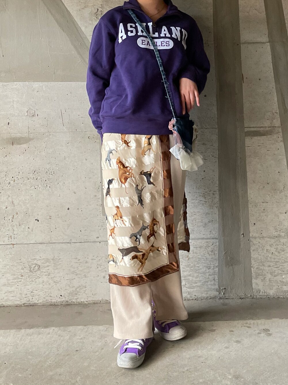 こんばんは スカーフをレイヤードするアレンジをしてみました!ワンコがいっぱいの柄が可愛くて❤️🔥 スニーカーは染めてムラサキに! バッグはデニムをリメイクして! 🦊スタイル全開な 🦊でした