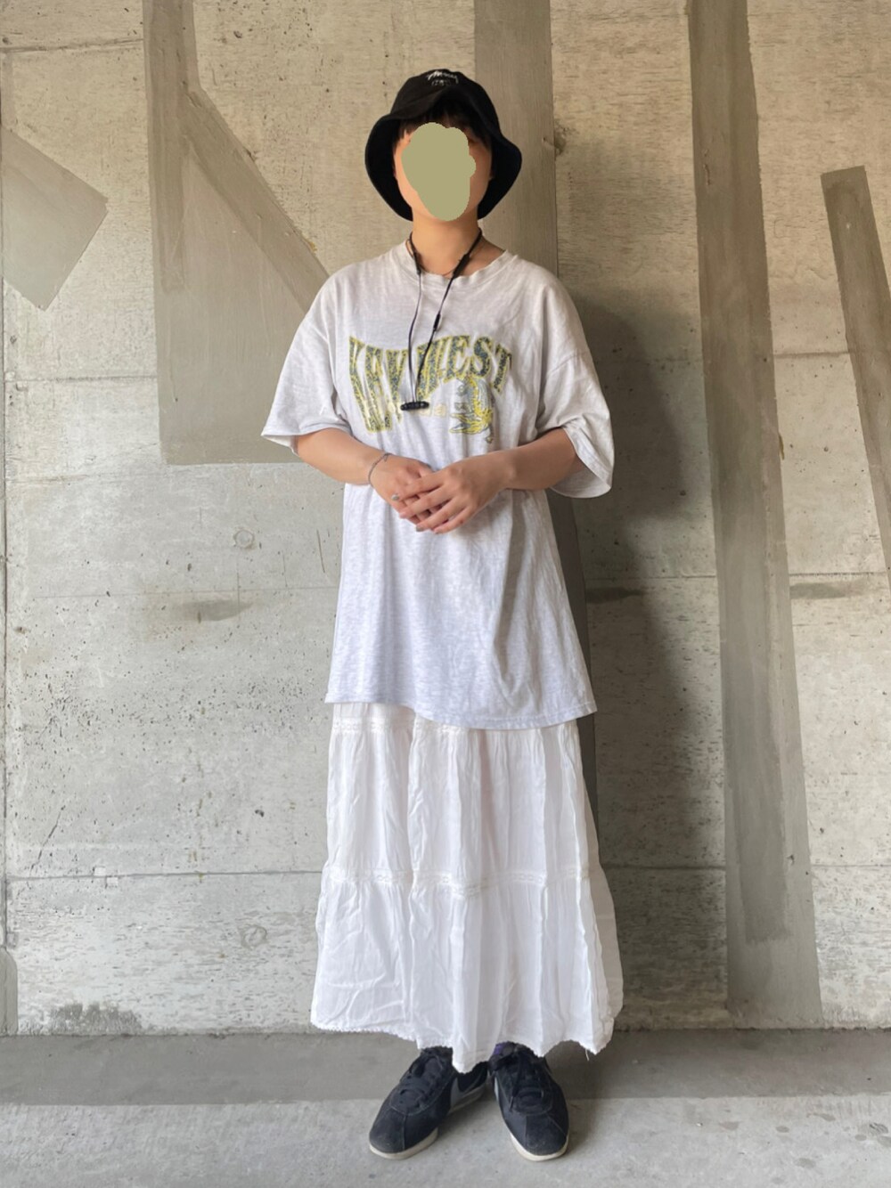 おはようございます パンダコーデだけど(モノクロ)遊び心を入れたくて恐竜Tシャツを仕込みました〜〜 ワニかな❔ 🦊でした