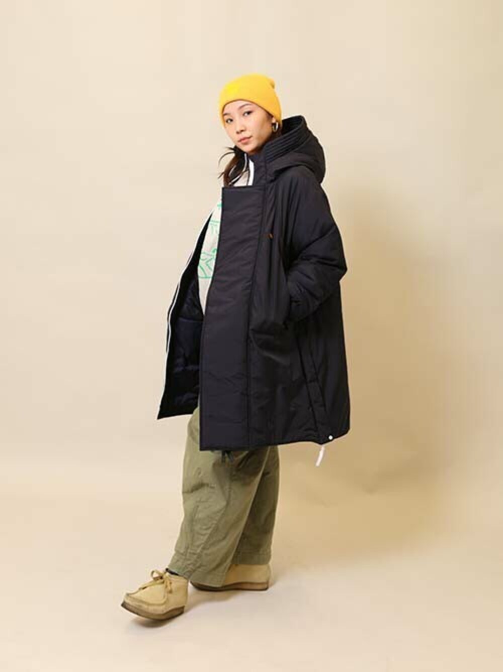 【着用アイテム】 アウター:UNION by WILD THINGS(Sサイズ) スウェット:UNION(Lサイズ) パンツ:NEEDLES 靴:CLARKS ニット帽:UNION