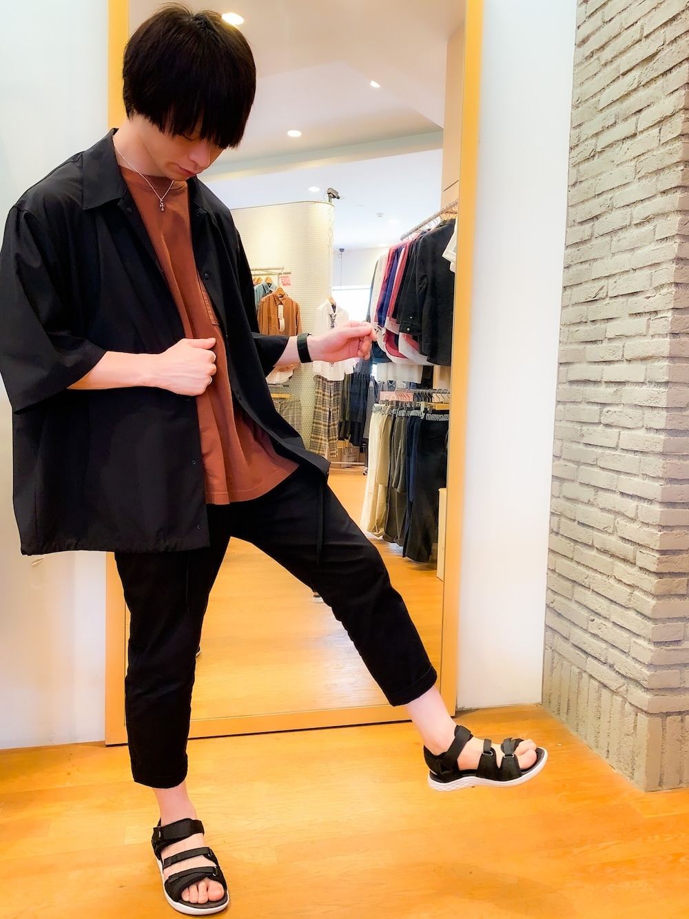 本日のコーデ 全体的に黒で固めてアクセントにインナーをブラウン系のカットソーに。 ラフなスタイルが1番好きです! フォローやいいねなどお待ちしてます!